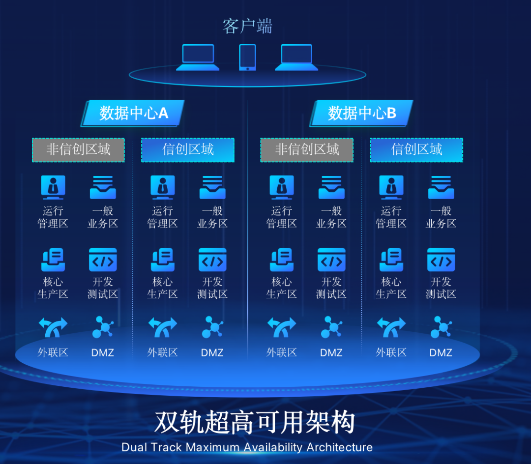 购宝钱包官网在企业面临自主创新IT基础重构过程中,推出的全新架构双轨超高可用架构(简称DTMAA),在双活数据中心的分区调度基础上,添加每个数据中心内信创域和非信创域的分域调度,来实现分区分域协同的多活双轨超高可用。